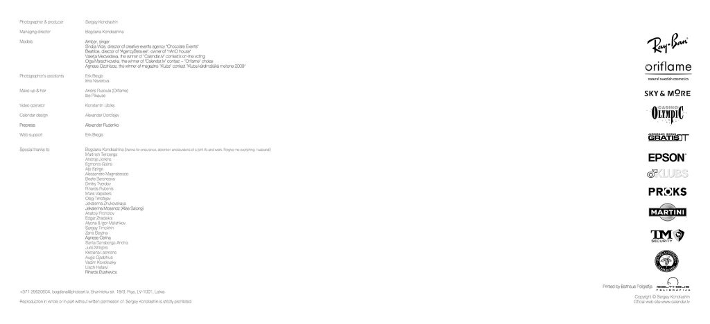 Amber, singer. Beatrice, director of “AgencyBeta.ee”, owner of “nAnO house”. Valerija Medvedeva, the winner of “Calendar.lv” contest’s on-line voting. Olga Marachkovska, the winner of “CalendarLv” contest – “Oriflame” choise. Sindija Vilde, director of creative events agency “Chocolate Events”. Agnese Ozolniece, the winner of magazine “Klubs” contest “Kluba kārdinošākā meitene 2009”