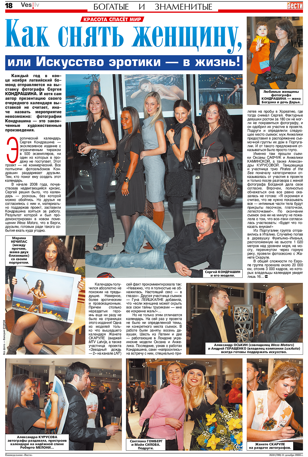 Эротический календарь Сергея Кондрашина — эксклюзивное издание с ограниченным тиражом в 500 экземпляров, ни один из которых в продажу не поступает. Этот проект — не коммерческий. Все полтысячи фотоальбомов Кондрашин раздаривает друзьям. Тем, кто помог ему создать этот календарь. В начале 2008 года, почувствовав надвигающийся кризис, Сергей решил было, что календарь — роскошь, без которой можно обойтись. Но друзья не согласились с ним и, материально поддержав проект, заставили Кондрашина взяться за работу. Результат которой и был продемонстрирован в новом помещении Wess Motors, что в Берги, друзьям, готовым ради такого события ехать куда угодно. Календарь получился абсолютно не похожим на предыдущие. Наверное, более эротическим и провокационным. Причем столько нераздетых героинь еще ни разу не было на страницах этого издания! Одна из моделей только что вышедшего календаря Жанете СКАРУЛЕ (виджей MTV Latvija, а также участница проекта «Звездный дождь — 2» на канале LNT) сей факт прокомментировала так: «Неважно, что я полностью не обнажилась. Настоящий секс — в глазах». Другая участница съемок — Гуна ЛЕЙШКАЛНЕ добавила, что «если женщина может скрыть все свои тайны трусиками — мне ее искренне жаль!»… Но не только этим отличается календарь. На сей раз у проекта не было ни определенной темы, ни конкретного места съемок. В работе были заняты восемь девушек. Шесть из Латвии и две — работающие в Лондоне украинские модели Оксана и Анжелика. Последние, узнав о работах Кондрашина, сами «напросились» на встречу с ним, специально при- летев на пробы в Хорватию, где тогда снимал Сергей. Фактурные девушки ростом за 180 см не могли не понравиться фотографу, и он одобрил их участие в проекте. Подруги и определили следующее место съемок: муж Анжелики предоставил в распоряжение съемочной группы их дом в Португалии. И от такого предложения отказываться было просто глупо. Именно там прошли съемки Оксаны САФЧУК и Анжелики КАМИНСКОЙ, а также Александры КУРУСОВОЙ. Танцовщица и участница трио Pirates of the Sea поначалу категорически отказывалась от участия в проекте и только после разговора с женой фотографа Богданой дала свое согласие. Впрочем, полностью обнажаться она все равно оказалась не готова: «Я скромная и считаю, что не нужно показывать все — интимные части тела будут прикрыты песочком, платочком, лепесточками!». По окончании съемок она ни на минуту не пожалела о том, что все–таки согласилась участвовать: «Будет что по- казать внукам!» Из Португалии группа отправились в Италию. Случайно попав в деревушку Фуипьяно–Иманья, расположенную на высоте 1 020 метров над уровнем моря, на мосту, перекинутом через горную реку, провели фотосессию с Жанете Скаруле. В общей сложности по Европе группа проехала около 20 000 км, отсняв 3 000 кадров, из которых владельцы календаря увидят лишь 16…