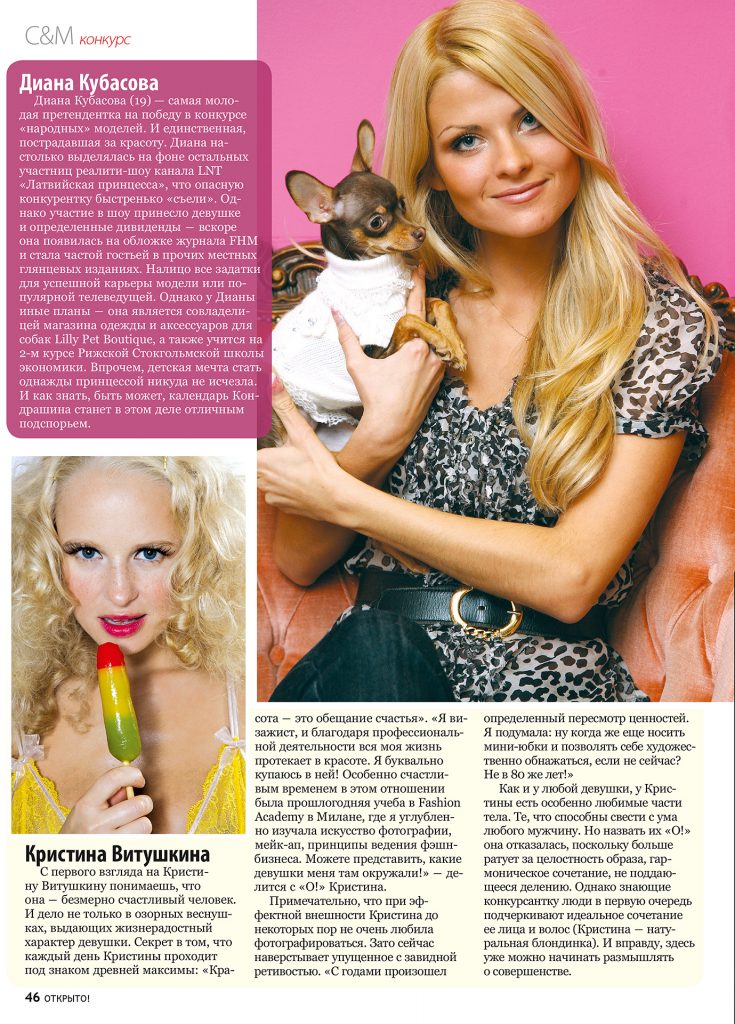 Диана Кубасова (19) — самая молодая претендентка на победу в конкурсе «народных» моделей. И единственная, пострадавшая за красоту. Диана настолько выделялась на фоне остальных участниц реалитишоу канала LNT «Латвийская принцесса», что опасную конкурентку быстренько «съели». Однако участие в шоу принесло девушке и определенные дивиденды ― вскоре она появилась на обложке журнала FHM и стала частой гостьей в прочих местных глянцевых изданиях. Налицо все задатки для успешной карьеры модели или популярной телеведущей. Однако у Дианы иные планы ― она является совладелицей магазина одежды и аксессуаров для собак Lilly Pet Boutique, а также учится на 2-м курсе Рижской Стокгольмской школы экономики. Впрочем, детская мечта стать однажды принцессой никуда не исчезла.
