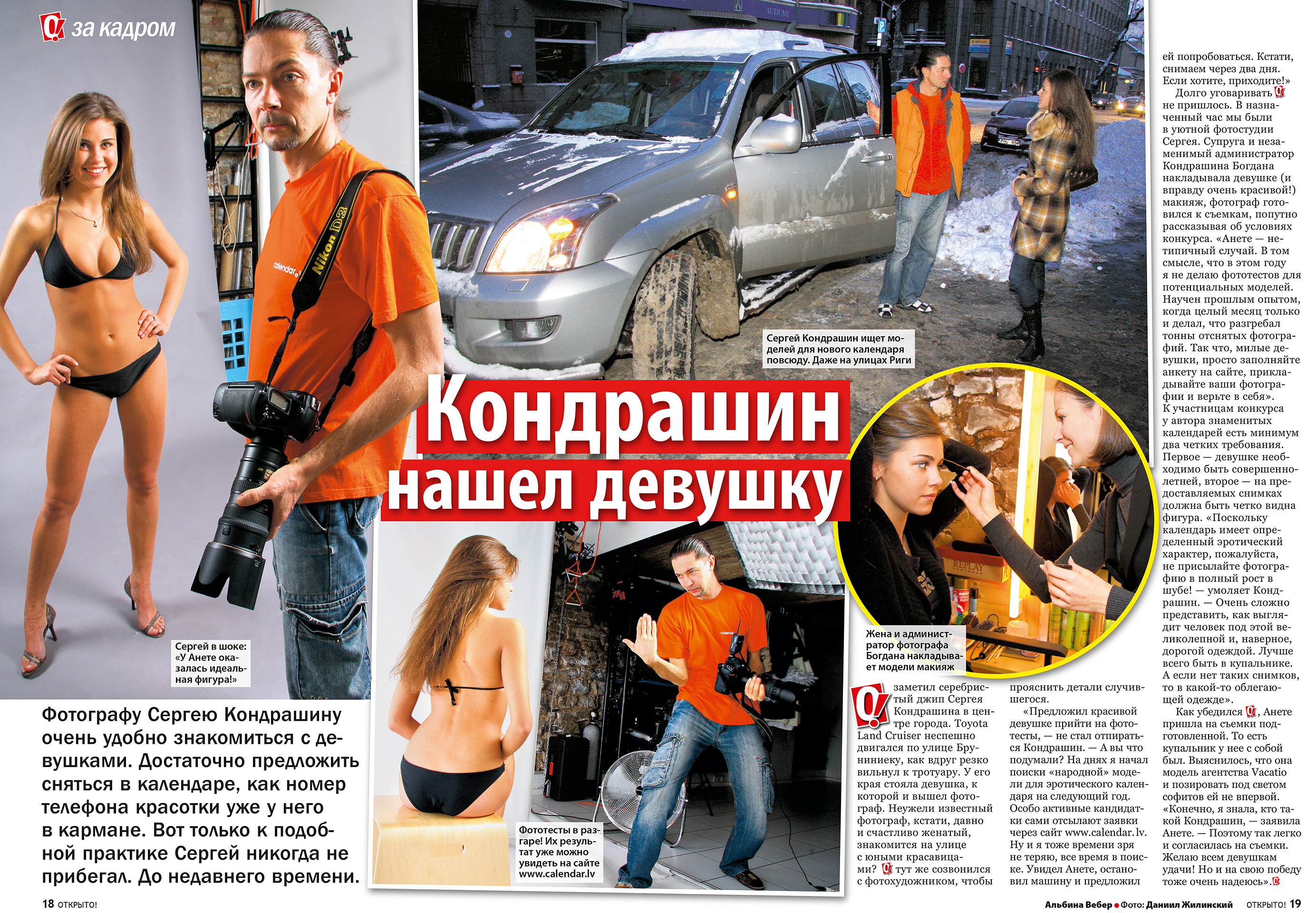 «Предложил красивой девушке прийти на фототесты, — не стал отпираться Кондрашин. — А вы что подумали? На днях я начал поиски «народной» модели для эротического календаря на следующий год.