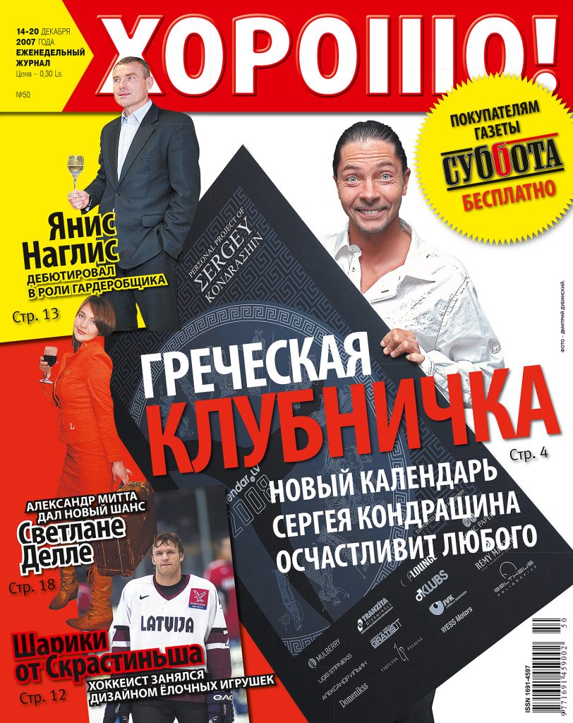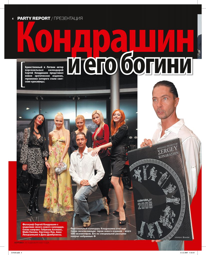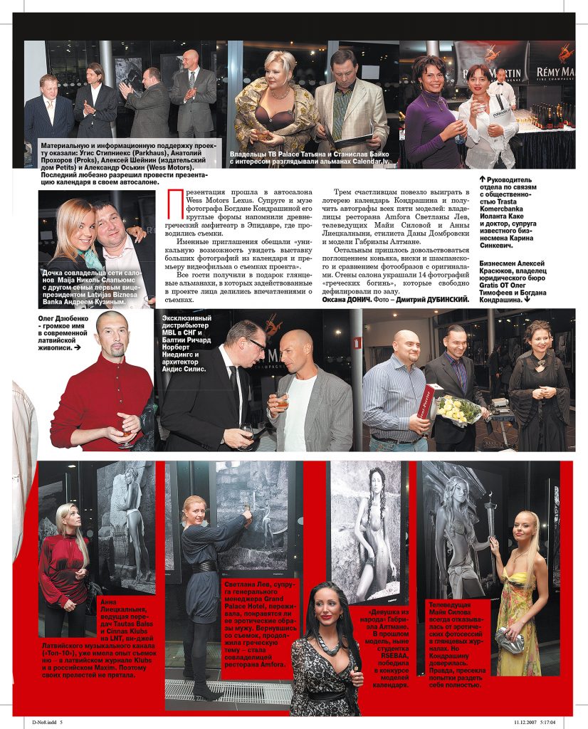 Презентация прошла в автосалона Wess Motors Lexus. Супруге и музе фотографа Богдане Кондрашиной его круглые формы напомнили древнегреческий амфитеатр в Эпидавре, где проводились съемки. Именные приглашения обещали «уникальную возможность увидеть выставкубольших фотографий из календаря и премьеру видеофильма о съемках проекта». Все гости получили в подарок глянцевые альманахи, в которых задействованные в проекте лица делились впечатлениями осъемках. Трем счастливцам повезло выиграть в лотерею календарь Кондрашина и получить автографы всех пяти моделей: владелицы ресторана Amfora Светланы Лев, телеведущих Майи Силовой и Анны Лиецкалныни, стилиста Даны Домбровски и модели Габриэлы Алтмане. Остальным пришлось довольствоваться поглощением коньяка, виски и шампанского и сравнением фотообразов с оригиналами. Стены салона украшали 14 фотографий «греческих богинь», которые свободно дефилировали по залу. Оксана ДОНИЧ. Фото – Дмитрий ДУБИНСКИЙ.