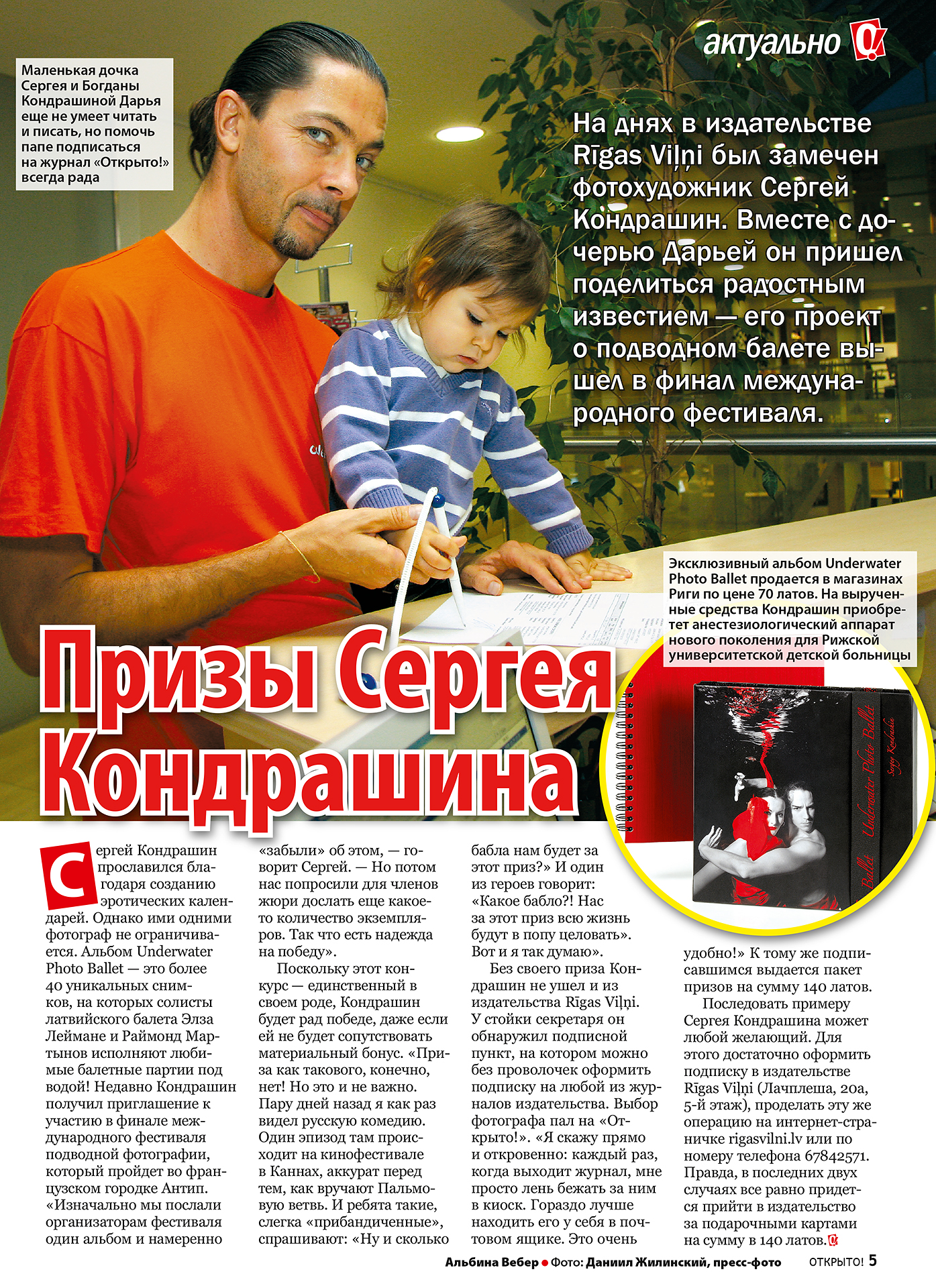 Сергей Кондрашин прославился благодаря созданию эротических календарей. Однако ими одними фотограф не ограничивается. Альбом Underwater Photo Ballet — это более 40 уникальных снимков, на которых солисты латвийского балета Элза Леймане и Раймонд Мартынов исполняют любимые балетные партии под водой! Недавно Кондрашин получил приглашение к участию в финале международного фестиваля подводной фотографии, который пройдет во французском городке Антип. «Изначально мы послали организаторам фестиваля один альбом и намеренно «забыли» об этом, — говорит Сергей. — Но потом нас попросили для членов жюри дослать еще какоето количество экземпляров. Так что есть надежда на по беду». Поскольку этот конкурс — единственный в своем роде, Кондрашин будет рад победе, даже если ей не будет сопутствовать материальный бонус. «Приза как такового, конечно, нет! Но это и не важно. Пару дней назад я как раз видел русскую комедию. Один эпизод там происходит на кинофестивале в Каннах, аккурат перед тем, как вручают Пальмовую ветвь. И ребята такие, слегка «прибандиченные», спрашивают: «Ну и сколько бабла нам будет за этот приз?» И один из героев говорит: «Какое бабло?! Нас за этот приз всю жизнь будут в попу целовать». Вот и я так думаю». Без своего приза Кондрашин не ушел и из издательства Rīgas Viļņi. У стойки секретаря он обнаружил подписной пункт, на котором можно без проволочек оформить подписку на любой из журналов издательства. Выбор фотографа пал на «Открыто!». «Я скажу прямо и откровенно каждый раз, когда выходит журнал, мне просто лень бежать за ним в киоск. Гораздо лучше находить его у себя в почтовом ящике. Это очень удобно!» К тому же подписавшимся выдается пакет призов на сумму 140 латов. Последовать примеру Сергея Кондрашина может любой желающий. Для этого достаточно оформить подписку в издательстве Rīgas Viļņi (Лачплеша, 20а, 5-й этаж), проделать эту же операцию на интернет-страничке rigasvilni.lv или по номеру телефона 67842571. Правда, в последних двух случаях все равно придется прийти в издательство за подарочными картами на сумму в 140 латов__