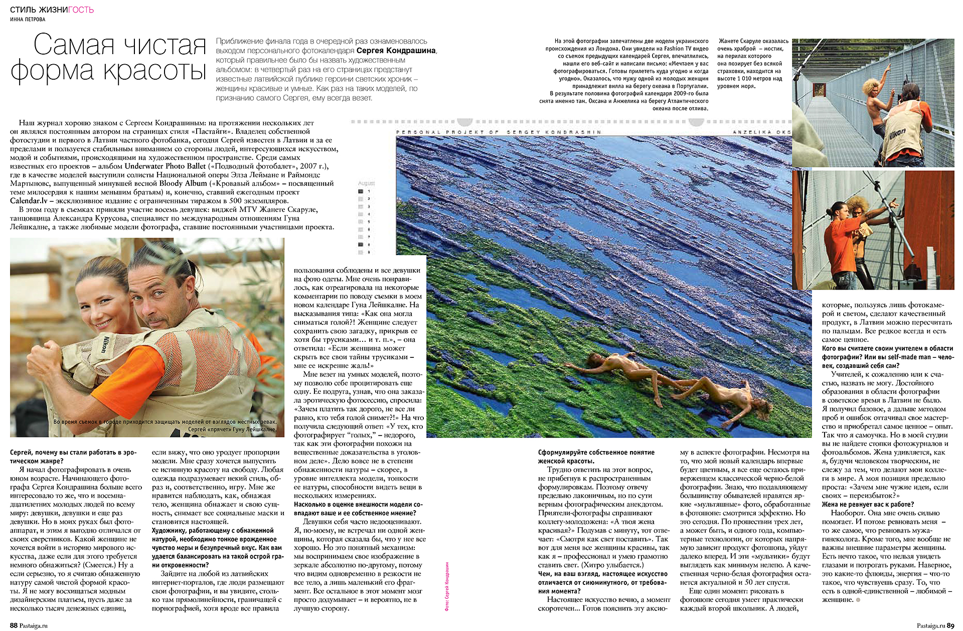 Наш журнал хорошо знаком с Сергеем Кондрашиным: на протяжении нескольких лет он являлся постоянным автором на страницах стиля «Пастайги». Владелец собственной фотостудии и первого в Латвии частного фотобанка, сегодня Сергей известен в Латвии и за ее пределами и пользуется стабильным вниманием со стороны людей, интересующихся искусством, модой и событиями, происходящими на художественном пространстве. Среди самых известных его проектов – альбом Underwater Photo Ballet («Подводный фотобалет», 2007 г.), где в качестве моделей выступили солисты Национальной оперы Элза Леймане и Раймондс Мартыновс, выпущенный минувшей весной Bloody Album («Кровавый альбом» – посвященный теме милосердия к нашим меньшим братьям) и, конечно, ставший ежегодным проект Calendarlv – эксклюзивное издание с ограниченным тиражом в 500 экземпляров. В этом году в съемках приняли участие восемь девушек: виджей MTV Жанете Скаруле, танцовщица Александра Курусова, специалист по международным отношениям Гуна Лейшкалне, а также любимые модели фотографа, ставшие постоянными участницами проекта. Сергей, почему вы стали работать в эротическом жанре? Я начал фотографировать в очень юном возрасте. Начинающего фотографа Сергея Кондрашина больше всего интересовало то же, что и восемнамиру: девушки, девушки и еще раз девушки. Но в моих руках был фотоаппарат, и этим я выгодно отличался от своих сверстников. Какой женщине не хочется войти в историю мирового искусства, даже если для этого требуется немного обнажиться? (Смеется.) Ну а если серьезно, то я считаю обнаженную натуру самой чистой формой красоты. Я не могу восхищаться модным дизайнерским платьем, пусть даже за несколько тысяч денежных единиц, если вижу, что оно уродует пропорции модели. Мне сразу хочется выпустить ее истинную красоту на свободу. Любая одежда подразумевает некий стиль, образ и, соответственно, игру. Мне же нравится наблюдать, как, обнажая тело, женщина обнажает и свою сущность, снимает все социальные маски и становится настоящей. Художнику, работающему с обнаженной натурой, необходимо тонкое врожденное чувство меры и безупречный вкус. Как вам удается балансировать на такой острой грани откровенности? Зайдите на любой из латвийских интернет-порталов, где люди размещают свои фотографии, и вы увидите, столько там прямолинейности, граничащей с порнографией, хотя вроде все правила пользования соблюдены и все девушки на фото одеты. Мне очень понравилось, как отреагировала на некоторые комментарии по поводу съемки в моем новом календаре Гуна Лейшкалне. На высказывания типа: «Как она могла сниматься голой?! Женщине следует сохранить свою загадку, прикрыв ее хотя бы трусиками… и т. п.», – она ответила: «Если женщина может скрыть все свои тайны трусиками – мне ее искренне жаль!» Мне везет на умных моделей, поэтому позволю себе процитировать еще одну. Ее подруга, узнав, что она заказала эротическую фотосессию, спросила: «Зачем платить так дорого, не все ли равно, кто тебя голой снимет?!» На что получила следующий ответ: «У тех, кто фотографирует “голых,” – недорого, так как эти фотографии похожи на вещественные доказательства в уголовном деле». Дело вовсе не в степени обнаженности натуры – скорее, в уровне интеллекта модели, тонкости ее натуры, способности видеть вещи в нескольких измерениях. Насколько в оценке внешности модел