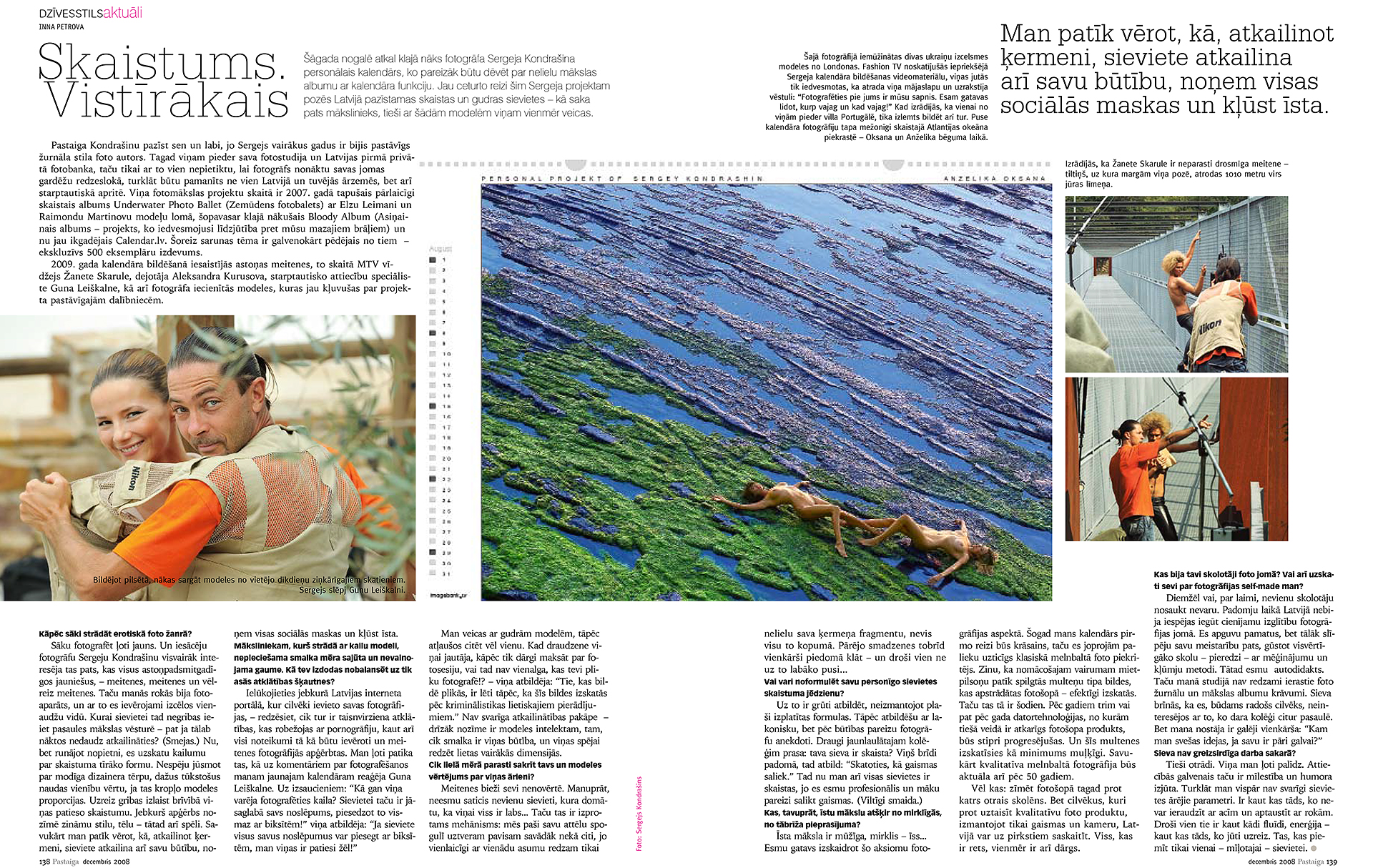 Pastaiga Kondrašinu pazīst sen un labi, jo Sergejs vairākus gadus ir bijis pastāvīgs žurnāla stila foto autors. Tagad viņam pieder sava fotostudija un Latvijas pirmā private fotobanka, taču tikai ar to vien nepietiktu, lai fotogrāfs nonāktu savas jomas gardēžu redzeslokā, turklāt būtu pamanīts ne vien Latvijā un tuvējās ārzemēs, bet arī starptautiskā apritē. Viņa fotomākslas projektu skaitā ir 2007. gadā tapušais pārlaicīgi skaistais albums Underwater Photo Ballet (Zemūdens fotobalets) ar Elzu Leimani un Raimondu Martinovu modeļu lomā, šopavasar klajā nākušais Bloody Album (Asiņainais albums – projekts, ko iedvesmojusi līdzjūtība pret mūsu mazajiem brāļiem) un nu jau ikgadējais Calendarlv. Šoreiz sarunas tēma ir galvenokārt pēdējais no tiem – ekskluzīvs 500 eksemplāru izdevums. 2009. gada kalendāra bildēšanā iesaistījās astoņas meitenes, to skaitā MTV vīdžejs Žanete Skarule, dejotāja Aleksandra Kurusova, starptautisko attiecību speciāliste Guna Leiškalne, kā arī fotogrāfa iecienītās modeles, kuras jau kļuvušas par projekta pastāvīgajām dalībniecēm. Kāpēc sāki strādāt erotiskā foto žanrā? Sāku fotografēt ļoti jauns. Un iesācēju fotogrāfu Sergeju Kondrašinu visvairāk interesēja tas pats, kas visus astoņpadsmitgadīgos jauniešus, – meitenes, meitenes un vēlreiz meitenes. Taču manās rokās bija fotoaparāts, un ar to es ievērojami izcēlos vienaudžu vidū. Kurai sievietei tad negribas ieiet pasaules mākslas vēsturē – pat ja tālab nāktos nedaudz atkailināties? (Smejas.) Nu, bet runājot nopietni, es uzskatu kailumu par skaistuma tīrāko formu. Nespēju jūsmot par modīga dizainera tērpu, dažus tūkstošus naudas vienību vērtu, ja tas kropļo modeles proporcijas. Uzreiz gribas izlaist brīvībā viņas patieso skaistumu. Jebkurš apģērbs nozīmē zināmu stilu, tēlu – tātad arī spēli. Savukārt man patīk vērot, kā, atkailinot ķermeni, sieviete atkailina arī savu būtību, no- ņem visas sociālās maskas un kļūst īsta. Māksliniekam, kurš strādā ar kailu modeli, nepieciešama smalka mēra sajūta un nevainojama gaume. Kā tev izdodas nobalansēt uz tik asās atklātības šķautnes? Ielūkojieties jebkurā Latvijas internet portālā, kur cilvēki ievieto savas fotogrāfijas, – redzēsiet, cik tur ir taisnvirziena atklātības, kas robežojas ar pornogrāfiju, kaut arī visi noteikumi tā kā būtu ievēroti un meitenes fotogrāfijās apģērbtas. Man ļoti patika tas, kā uz komentāriem par fotografēšanos manam jaunajam kalendāram reaģēja Guna Leiškalne. Uz izsaucieniem: “Kā gan viņa varēja fotografēties kaila? Sievietei taču ir jāsaglabā savs noslēpums, piesedzot to vismaz ar biksītēm!” viņa atbildēja: “Ja sieviete visus savus noslēpumus var piesegt ar biksītēm, man viņas ir patiesi žēl!” Man veicas ar gudrām modelēm, tāpēc atļaušos citēt vēl vienu. Kad draudzene viņai jautāja, kāpēc tik dārgi maksāt par fotosesiju, vai tad nav vienalga, kas tevi pliku fotografē!? – viņa atbildēja: “Tie, kas bildē plikās, ir lēti tāpēc, ka šīs bildes izskatās pēc kriminālistikas lietiskajiem pierādījumiem.” Nav svarīga atkailinātības pakāpe – drīzāk nozīme ir modeles intelektam, tam, cik smalka ir viņas būtība, un viņas spējai redzēt lietas vairākās dimensijās. Cik lielā mērā parasti sakrīt tavs un modeles vērtējums par viņas ārieni? Meitenes bieži sevi nenovērtē. Manuprāt, neesmu saticis nevienu sievieti, kura domātu, ka viņai viss ir labs… Taču tas ir izprotams mehānisms: mēs paši savu attēlu spogulī uztveram pavisam savādāk nekā citi, jo vienlaicīgi ar vienādu asumu redzam tikai nelielu sava ķermeņa fragmentu, nevis visu to kopumā. Pārējo smadzenes tobrīd vienkārši piedomā klāt – un droši vien ne uz to labāko pusi… Vai vari noformulēt savu personīgo sievietes skaistuma jēdzienu? Uz to ir grūti atbildēt, neizmantojot plaši izplatītas formulas. Tāpēc atbildēšu ar lakonisku, bet pēc būtības pareizu fotogrāfu anekdoti. Draugi jaunlaulātajam kolēģim prasa: tava sieva ir skaista? Viņš brīdi padomā, tad atbild: “Skatoties, kā gaismas saliek.” Tad nu man arī visas sievietes ir skaistas, jo es esmu profesionālis un māku pareizi salikt gaismas. (Viltīgi smaida.) Kas, tavuprāt, īstu mākslu atšķir no mirklīgās, no tābrīža pieprasījuma? Īsta māksla ir mūžīga, mirklis – īss… Esmu gatavs izskaidrot šo aksiomu fotogrāfijas aspektā. Šogad mans kalendārs pirmo reizi būs krāsains, taču es joprojām palieku uzticīgs klasiskā melnbaltā foto piekritējs. Zinu, ka nomācošajam vairumam mietpilsoņu patīk spilgtās multeņu tipa bildes, kas apstrādātas fotošopā – efektīgi izskatās. Taču tas tā ir šodien. Pēc gadiem trim vai pat pēc gada datortehnoloģijas, no kurām tiešā veidā ir atkarīgs fotošopa produkts, būs stipri progresējušas. Un šīs multenes izskatīsies kā minimums muļķīgi. Savukārt kvalitatīva melnbaltā fotogrāfija būs aktuāla arī pēc 50 gadiem. Vēl kas: zīmēt fotošopā tagad prot katrs otrais skolēns. Bet cilvēkus, kuri prot uztaisīt kvalitatīvu foto produktu, izmantojot tikai gaismas un kameru, Latvijā var uz pirkstiem saskaitīt. Viss, kas ir rets, vienmēr ir arī dārgs. Izrādījās, ka Žanete Skarule ir neparasti drosmīga meitene – tiltiņš, uz kura margām viņa pozē, atrodas 1010 metru virs jūras līmeņa. Kas bija tavi skolotāji foto jomā? Vai arī uzskati sevi par fotogrāfijas self-made man? Diemžēl vai, par laimi, nevienu skolotāju nosaukt nevaru. Padomju laikā Latvijā nebija iespējas iegūt cienījamu izglītību fotogrāfijas jomā. Es apguvu pamatus, bet tālāk slīpēju savu meistarību pats, gūstot visvērtīgāko skolu – pieredzi – ar mēģinājumu un kļūmju metodi. Tātad esmu autodidakts. Taču man