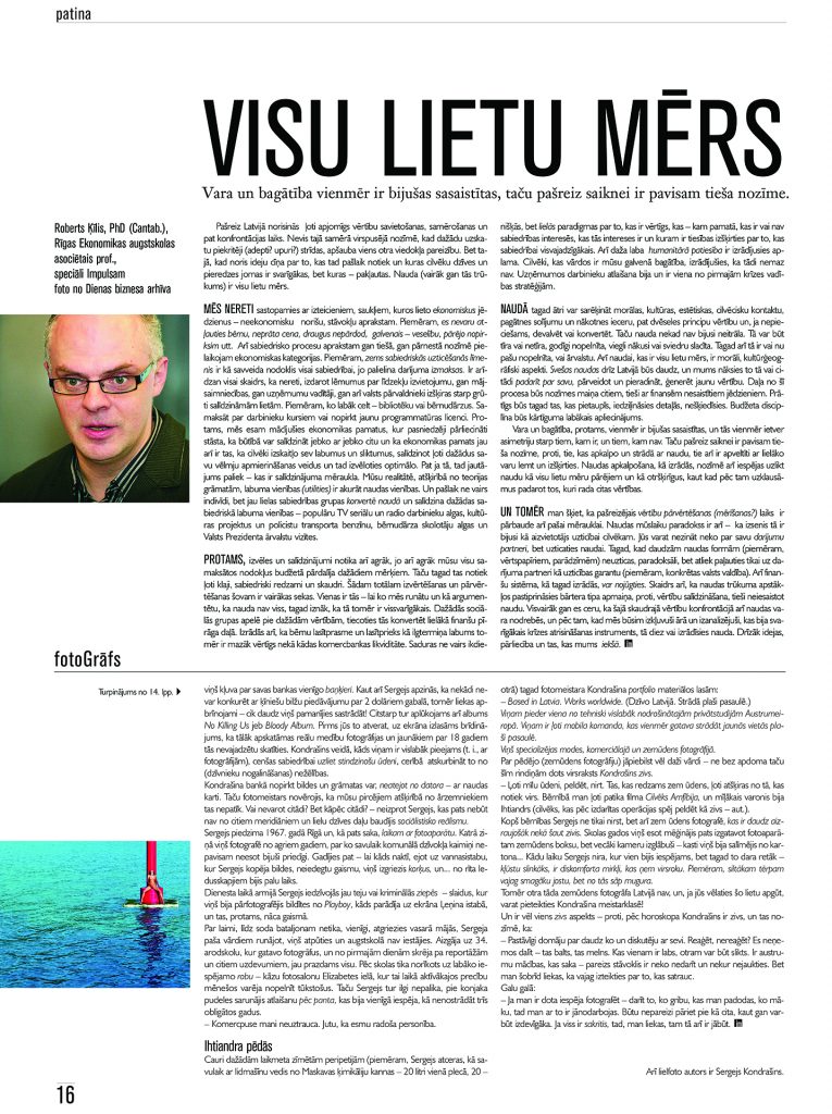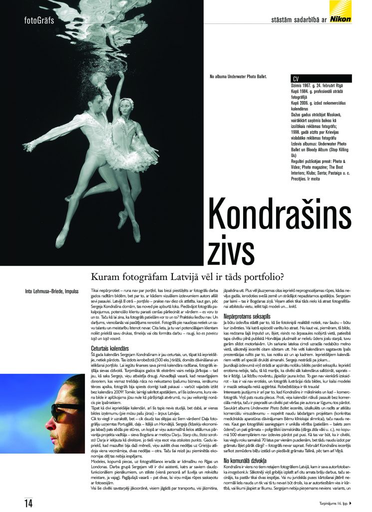 un citiem uzdevumiem, jau prazdams visu. Pēc skolas tika norīkots uz labāko iespējamo robu – kāzu fotosalonu Elizabetes ielā, kur tai laikā aktīvākajos precību mēnešos varēja nopelnīt tūkstošus. Taču Sergejs tur ilgi nepalika, pie konjaka pudeles sarunājis atlaišanu pēc panta, kas bija vienīgā iespēja, kā nenostrādāt trīs obligātos gadus. – Komercpuse mani neuztrauca. Jutu, ka esmu radoša personība. Ihtiandra pedas Cauri dažādām laikmeta zīmētām peripetijām (piemēram, Sergejs atceras, kā savulaik ar lidmašīnu vedis no Maskavas ķimikāliju kannas – 20 litri vienā plecā, 20 – otrā) tagad fotomeistara Kondrašina portfolio materiālos lasām:– Based in Latvia. Works worldwide. (Dzīvo Latvijā. Strādā plaši pasaulē.) Viņam pieder viena no tehniski vislabāk nodrošinātajām privātstudijām Austrumeiropā. Viņam ir ļoti mobila komanda, kas vienmēr gatava strādāt jaunās vietās plaši pasaulē. Viņš specializējas modes, komerciālajā un zemūdens fotogrāfijā. Par pēdējo (zemūdens fotogrāfiju) jāpiebilst vēl daži vārdi – ne bez apdoma taču šīm rindiņām dots virsraksts Kondrašins zivs. – Ļoti mīlu ūdeni, peldēt, nirt. Tas, kas redzams zem ūdens, ļoti atšķiras no tā, kas notiek virs. Bērnībā man ļoti patika filma Cilvēks Amfībija, un mīļākais varonis bija Ihtiandrs (cilvēks, kas pēc izdarītas operācijas spēj peldēt kā zivs – aut.). Kopš bērnības Sergejs ne tikai nirst, bet arī zem ūdens fotografē, kas ir daudz aizraujošāk nekā šaut zivis. Skolas gados viņš esot mēģinājis pats izgatavot fotoaparātam zemūdens boksu, bet vecāki kameru izglābuši – kasti viņš bija salīmējis no kartona… Kādu laiku Sergejs nira, kur vien bijis iespējams, bet tagad to dara retāk – kļūstu slinkāks, ir diskomforta mirkļi, kas ņem virsroku. Piemēram, siltākam tērpam vajag smagāku jostu, bet no tās sāp mugura. Tomēr otra tāda zemūdens fotogrāfa Latvijā nav, un, ja jūs vēlaties šo lietu apgūt, varat pieteikties Kondrašina meistarklasē! Un ir vēl viens zivs aspekts proti, pēc horoskopa Kondrašins ir zivs, un tas nozīmē, ka: