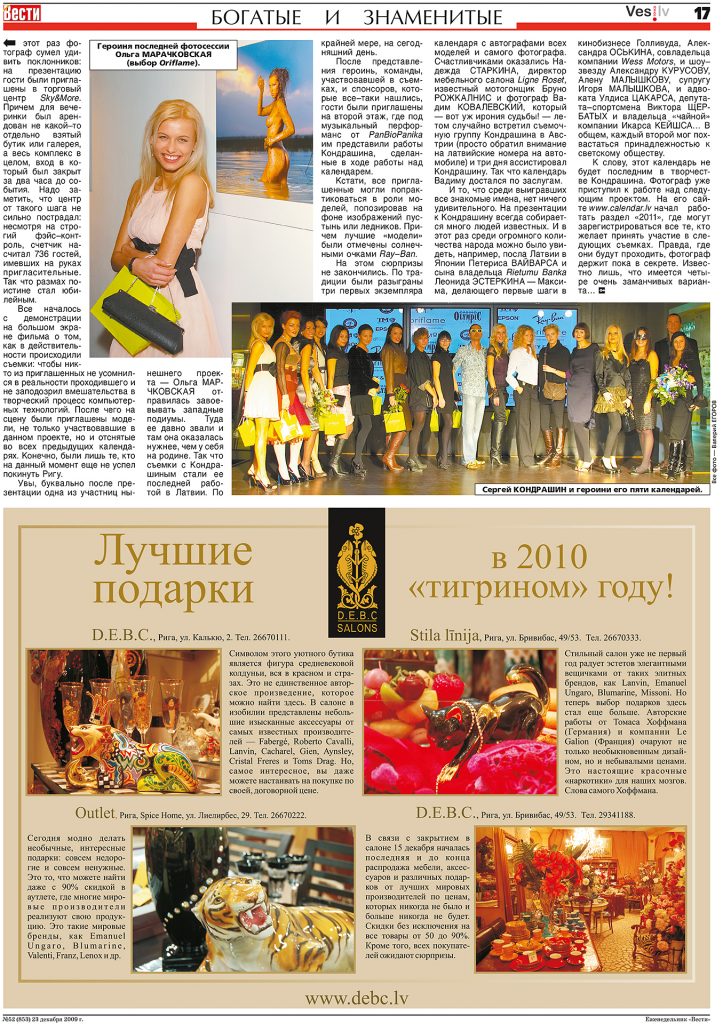 моделей и самого фотографа. Счастливчиками оказались Надежда СТАРКИНА, директор мебельного салона Ligne Roset, известный мотогонщик Бруно РОЖКАЛНИС и фотограф Вадим КОВАЛЕВСКИЙ, который — вот уж ирония судьбы! — летом случайно встретил съемочную группу Кондрашина в Австрии (просто обратил внимание на латвийские номера на автомобиле) и три дня ассистировал Кондрашину. Так что календарь