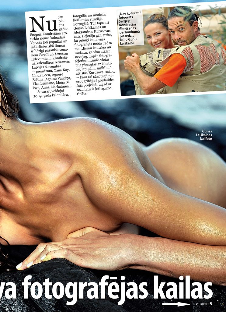 — piemēram, Yana Kay, Linda Leen, Agnese Zeltiņa, Agnese Vārpiņa, Elza Leimane, Maija Silova, Anna Lieckalniņa… Šovasar, veidojot 2009. gada kalendāru, fotogrāfs un modeles lielākoties strādāja Portugālē. Tur tapa arī Gunas Leiškalnes un Aleksandras Kurusovas akti. Dejotāja gan atzīst, ka pilnīgi kaila viņa fotogrāfijās nebūs redzama. „Esmu kautrīga un uzskatu, ka visu atklāt nevajag. Tāpēc fotografējoties intīmās vietas bija piesegtas ar lakatiņu, lapiņām, smiltīm,” atzīstas Kurusova, sakot, — kaut arī sākotnēji neesot gribējusi piedalīties šajā projektā, tagad ar rezultātu ir ļoti apmierināta