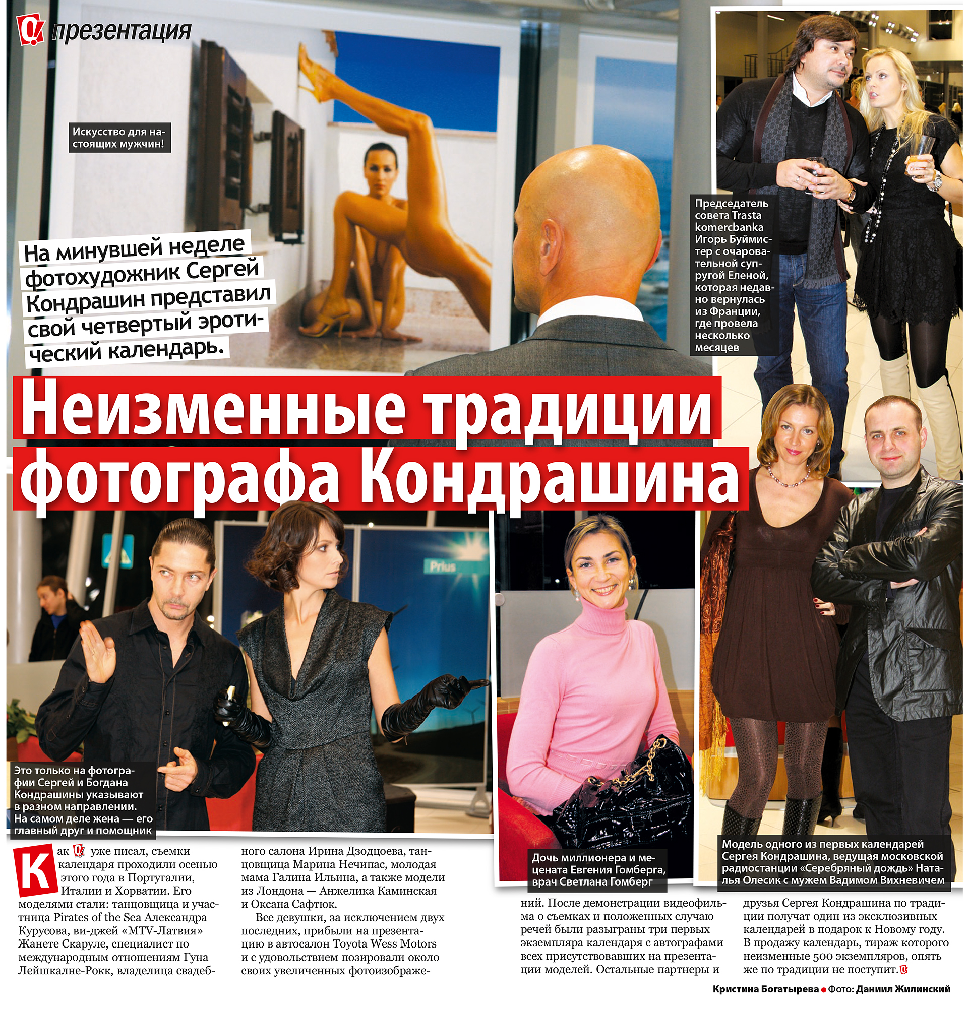 речей были разыграны три первых экземпляра календаря с автографами всех присутствовавших на презентации моделей. Остальные партнеры и друзья Сергея Кондрашина по традиции получат один из эксклюзивных календарей в подарок к Новому году. В продажу календарь, тираж которого неизменные 500 экземпляров, опять же по традиции не поступит.