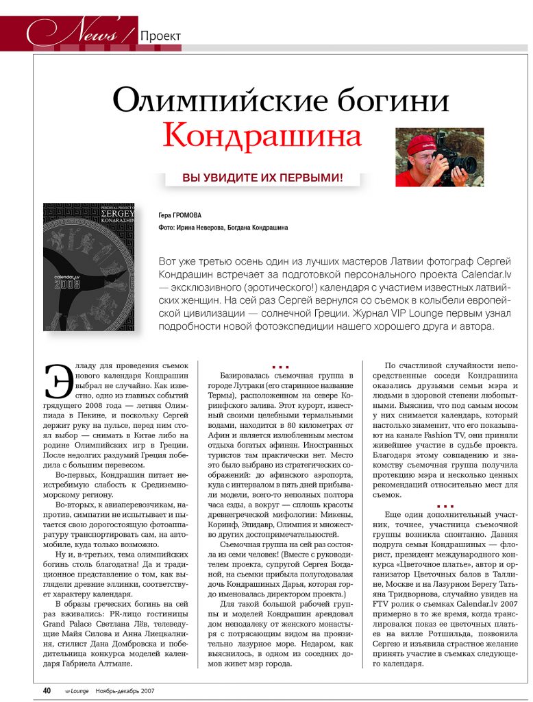 Вот уже третью осень один из лучших мастеров Латвии фотограф Сергей Кондрашин встречает за подготовкой персонального проекта Calendarlv — эксклюзивного (эротического!) календаря с участием известных латвийских женщин. На сей раз Сергей вернулся со съемок в колыбели европейской цивилизации — солнечной Греции. Журнал VIP Lounge первым узнал подробности новой фотоекспедиции нашего хорошего друга и автора.