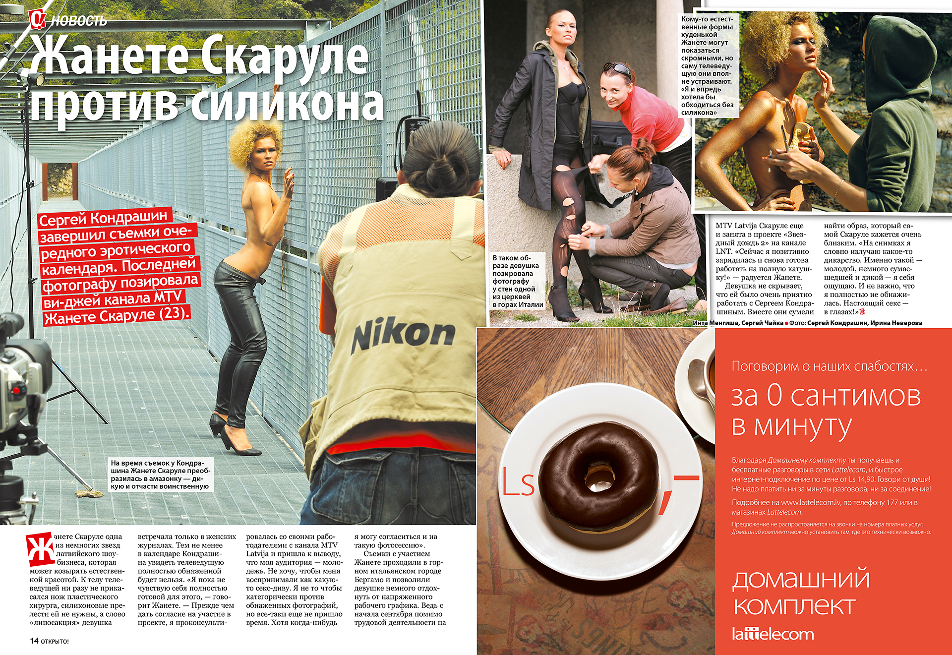 На время съемок у Кондрашина Жанете Скаруле преобразилась в амазонку — дикую и отчасти воинственную Жанете Скаруле одна из немногих звезд латвийского шоу-бизнеса, которая может козырять естественной красотой. К телу телеведущей ни разу не прикасался нож пластического хирурга, силиконовые прелести ей не нужны, а слово «липосакция» девушка встречала только в женских журналах. Тем не менее в календаре Кондрашина увидеть телеведущую полностью обнаженной будет нельзя. «Я пока не чувствую себя полностью готовой для этого, — говорит Жанете. — Прежде чем дать согласие на участие в проекте, я проконсультировалась со своими работодателями с канала MTV Latvija и пришла к выводу, что моя аудитория — молодежь. Не хочу, чтобы меня воспринимали как какуюто секс-диву. Я не то чтобы категорически против обнаженных фотографий, но все-таки еще не пришло время. Хотя когда-нибудь я могу согласиться и на такую фотосессию». Съемки с участием Жанете проходили в горном итальянском городе Бергамо и позволили девушке немного отдохнуть от напряженного рабочего графика. Ведь с начала сентября помимо трудовой деятельности на MTV Latvija MTV Latvija Скаруле еще и занята в проекте «Звездный дождь 2» на канале LNT. «Сейчас я позитивно зарядилась и снова готова работать на полную катушку!» — радуется Жанете. Девушка не скрывает, что ей было очень приятно работать с Сергеем Кондрашиным. Вместе они сумели найти образ, который самой Скаруле кажется очень близким. «На снимках я словно излучаю какое-то дикарство. Именно такой — молодой, немного сумасшедшей и дикой — я себя ощущаю. И не важно, что я полностью не обнажилась. Настоящий секс — в глазах!